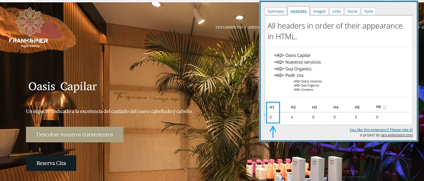 ❌ En el caso de esta web, falta el título H1. Esta etiqueta es la más importante de todas porque sirve para que Google entienda qué es lo más importante del contenido.